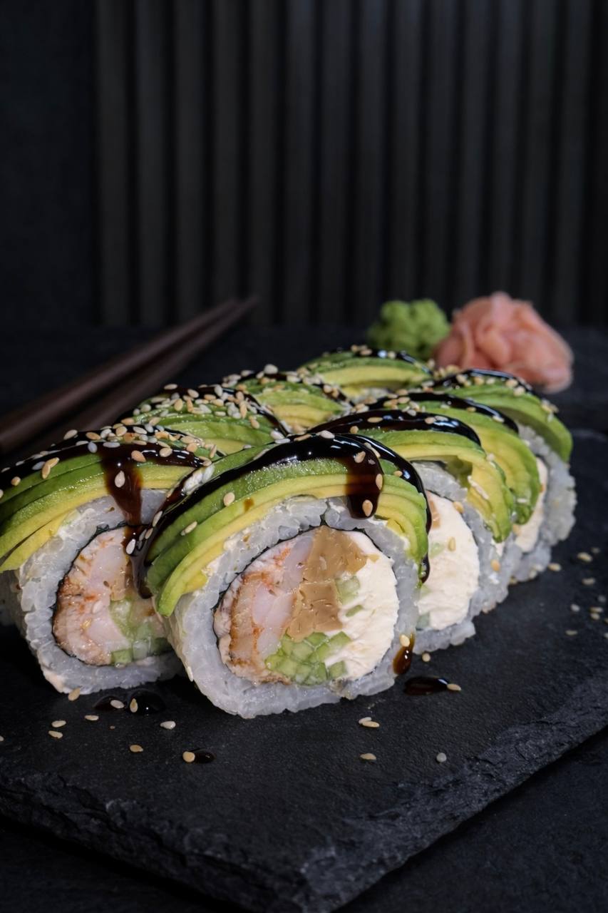 Зверху рол щедро вкритий стиглим авокадо, политий ароматним соусом унагі та посипаний кунжутом, що додає легку солодкувату нотку.
