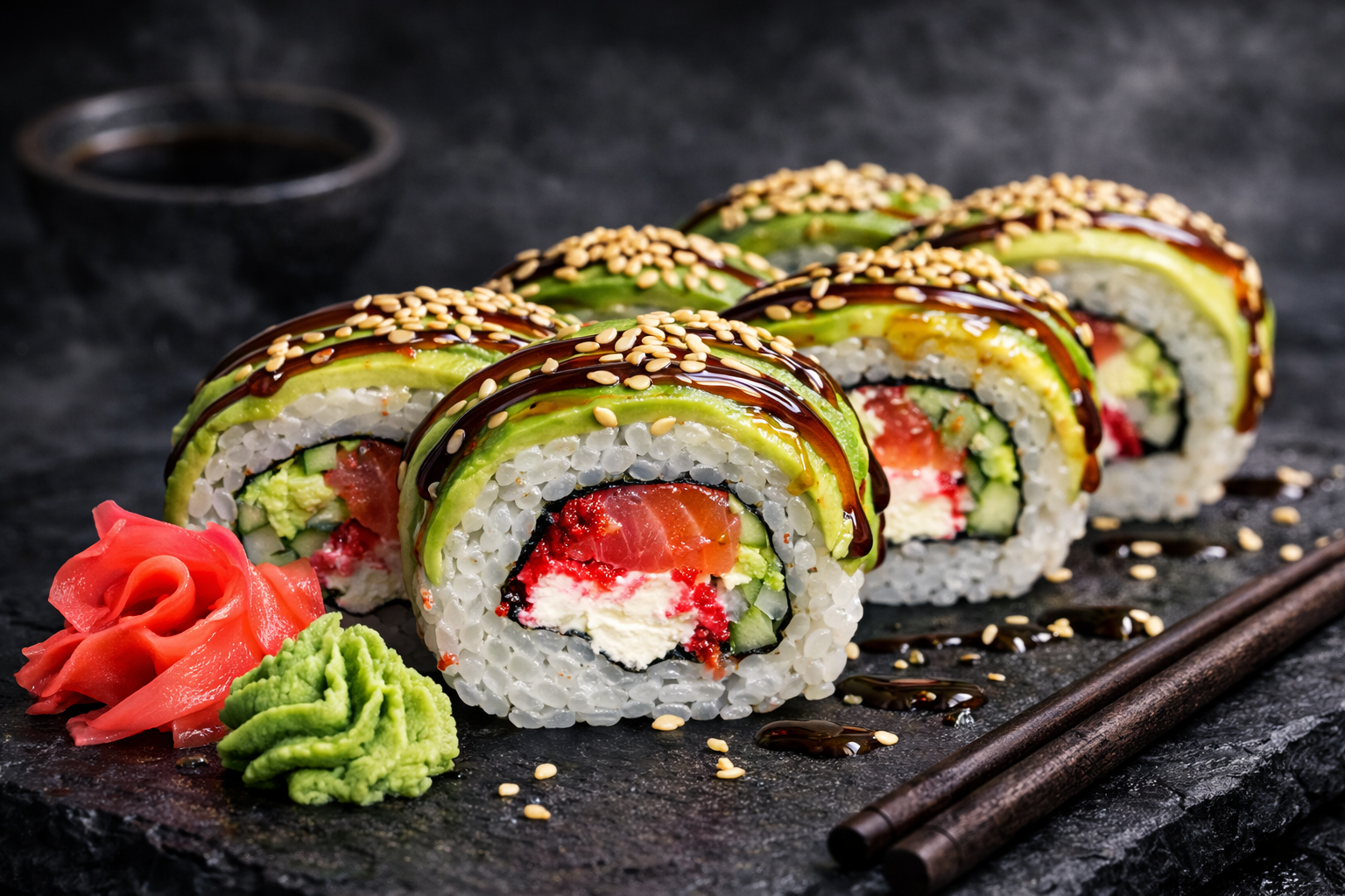 Рол доповнений ароматним соусом унагі та кунжутом, що створює ідеальний баланс свіжості, кремової текстури та легкої солодкуватої нотки.