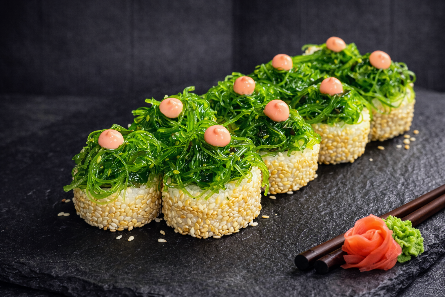 Легкий та свіжий футомакі для любителів овочевих ролів. Усередині — хрусткий огірок, ніжне авокадо та салат чука, які ідеально поєднуються з ароматним горіховим соусом. Завершує смак легка посипка кунжуту, додаючи ролу приємної текстури та східної нотки.