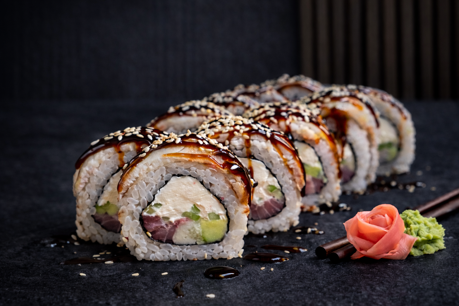Зверху рол політий ароматним соусом унагі та посипаний кунжутом, що додає приємну солодкувато-копчену нотку.