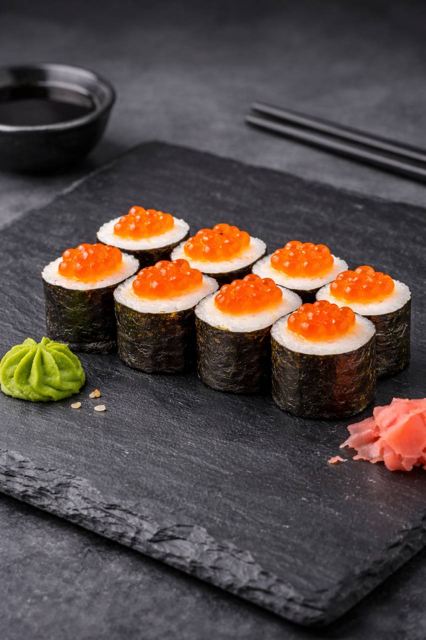 Ніжний рис, загорнутий у лист норі, та щедра шапочка соковитої лососевої ікри. Ікра додає ролу яскравий морський смак і легку солонувату нотку, що ідеально поєднується з м’яким рисом.