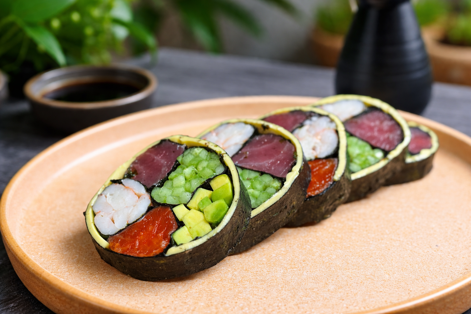 Яскравий футомакі з різноманітною начинкою, що створює ефект справжньої мозаїки у кожному шматочку. Усередині — соковитий лосось, ніжний тунець, тигрова креветка, свіжий огірок та кремовий авокадо. Поєднання різних інгредієнтів дарує насичений смак і гармонійний баланс морепродуктів та свіжості.