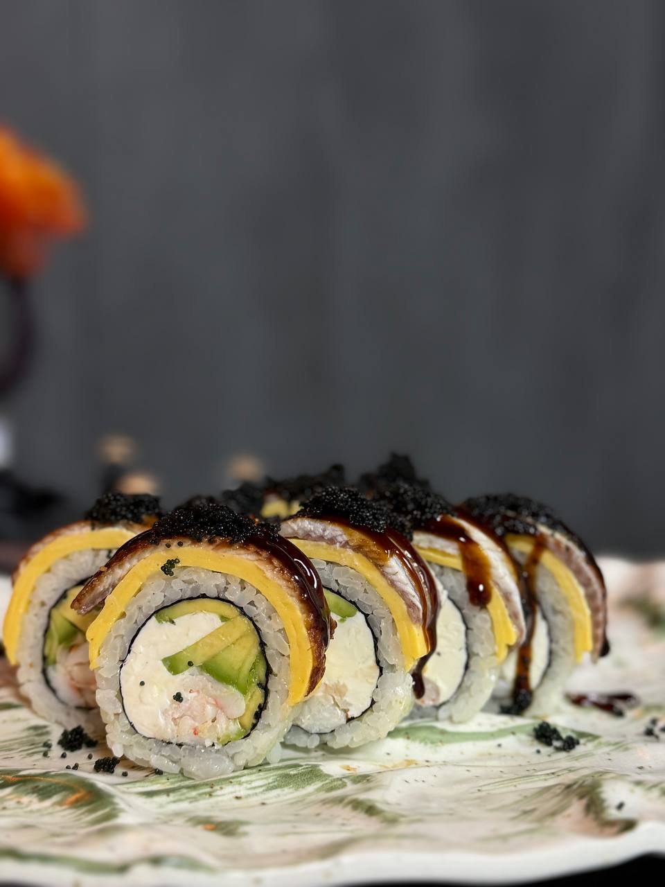 Зверху — ароматний вугор, чедер, соус унагі та чорна ікра тобіко, що додає глибини смаку і преміального акценту.