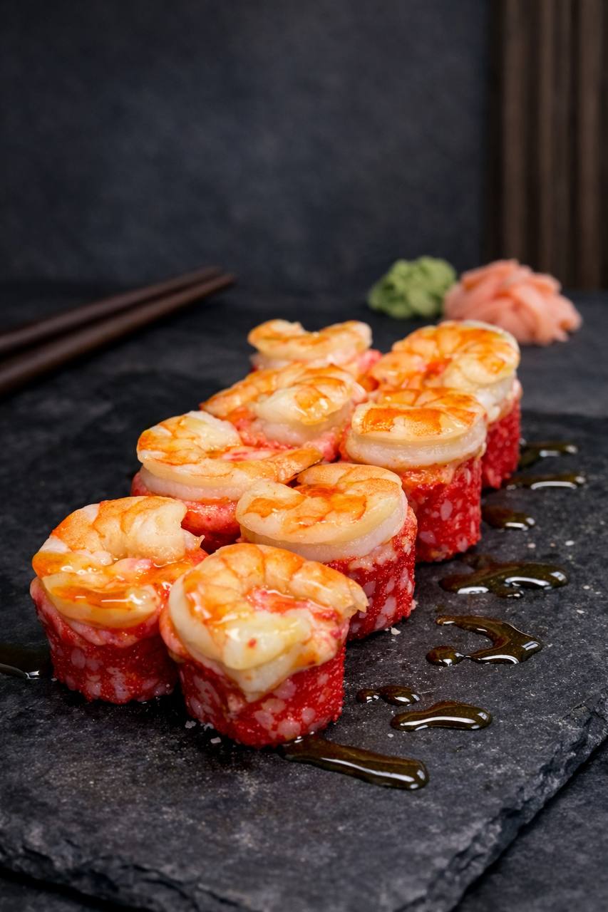 Зверху рол прикрашає соковита тигрова креветка, яка робить смак ще більш насиченим і делікатним.