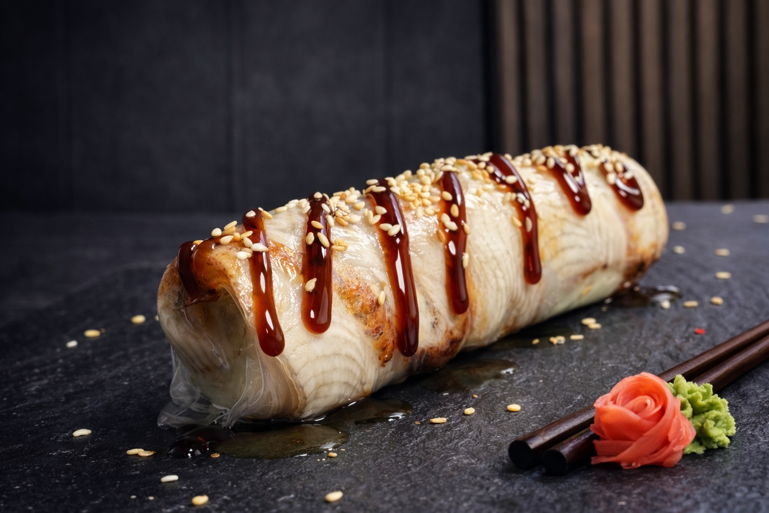 Ніжний рол у рисовому папері з крем-сиром, свіжим авокадо, хрустким огірком та салатом. Усередині — ароматний копчений вугор, який чудово поєднується з соусом Унагі та легким кунжутом, додаючи ролу насиченого солодко-солоного смаку. Подається цілим, без розрізу, щоб зберегти соковитість і текстуру інгредієнтів.