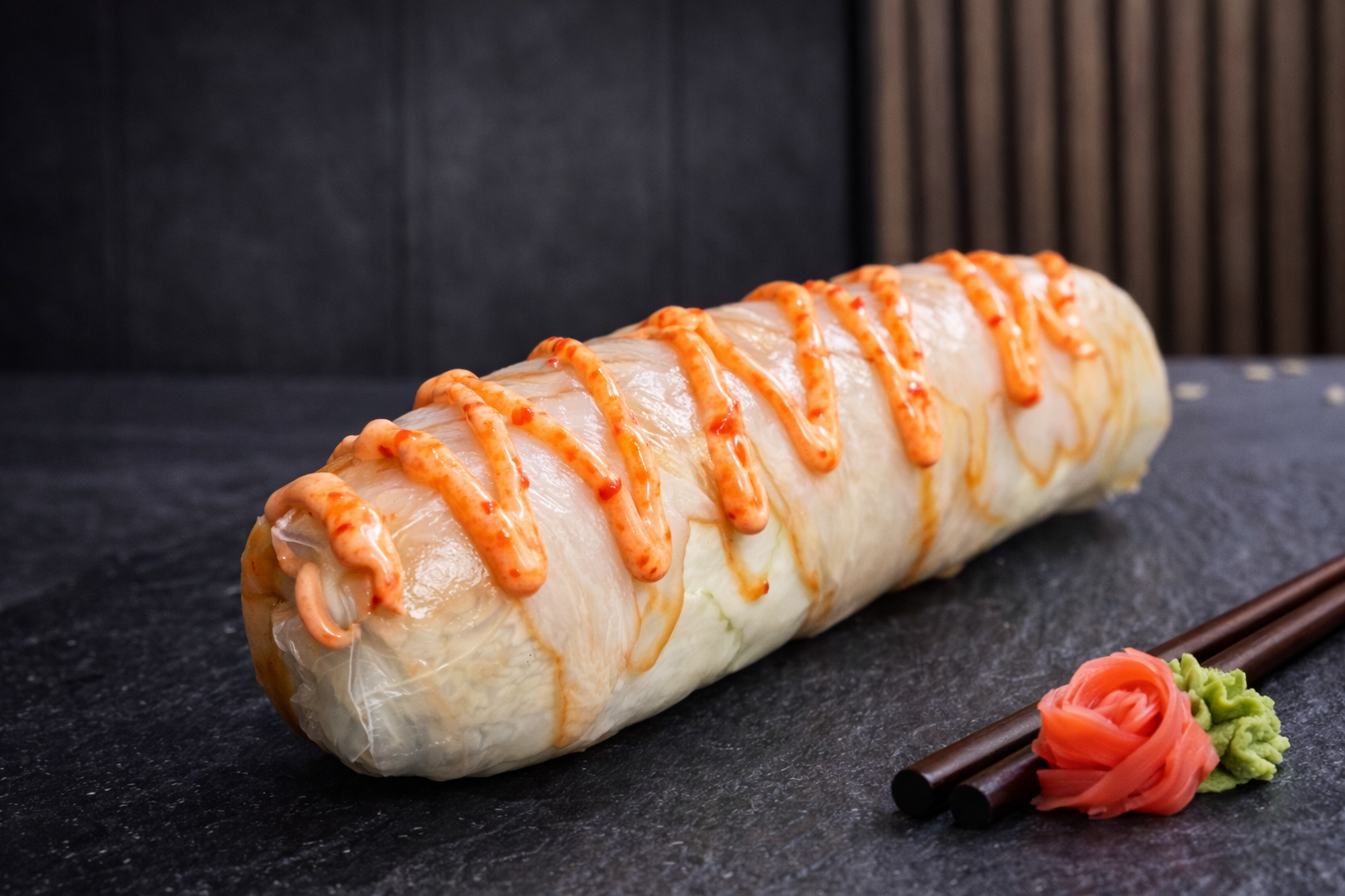 Ніжний рол у рисовому папері з крем-сиром, свіжим салатом, хрустким огірком та болгарським перцем. Усередині — ароматна копчена курка, яка чудово поєднується з пікантним соусом спайсі, додаючи ролу яскравого та насиченого смаку. Подається цілим, без розрізу, щоб зберегти соковитість і текстуру інгредієнтів.