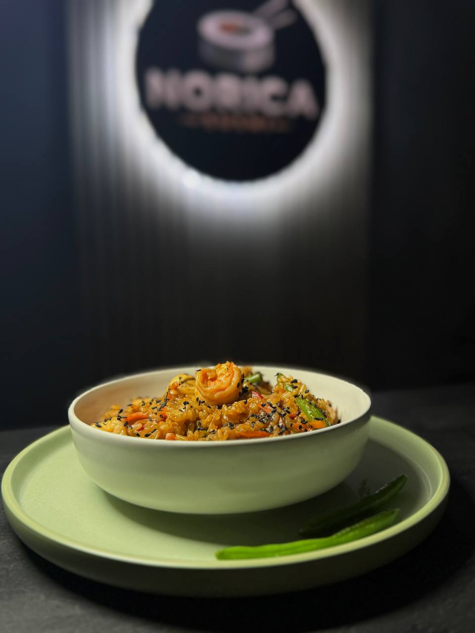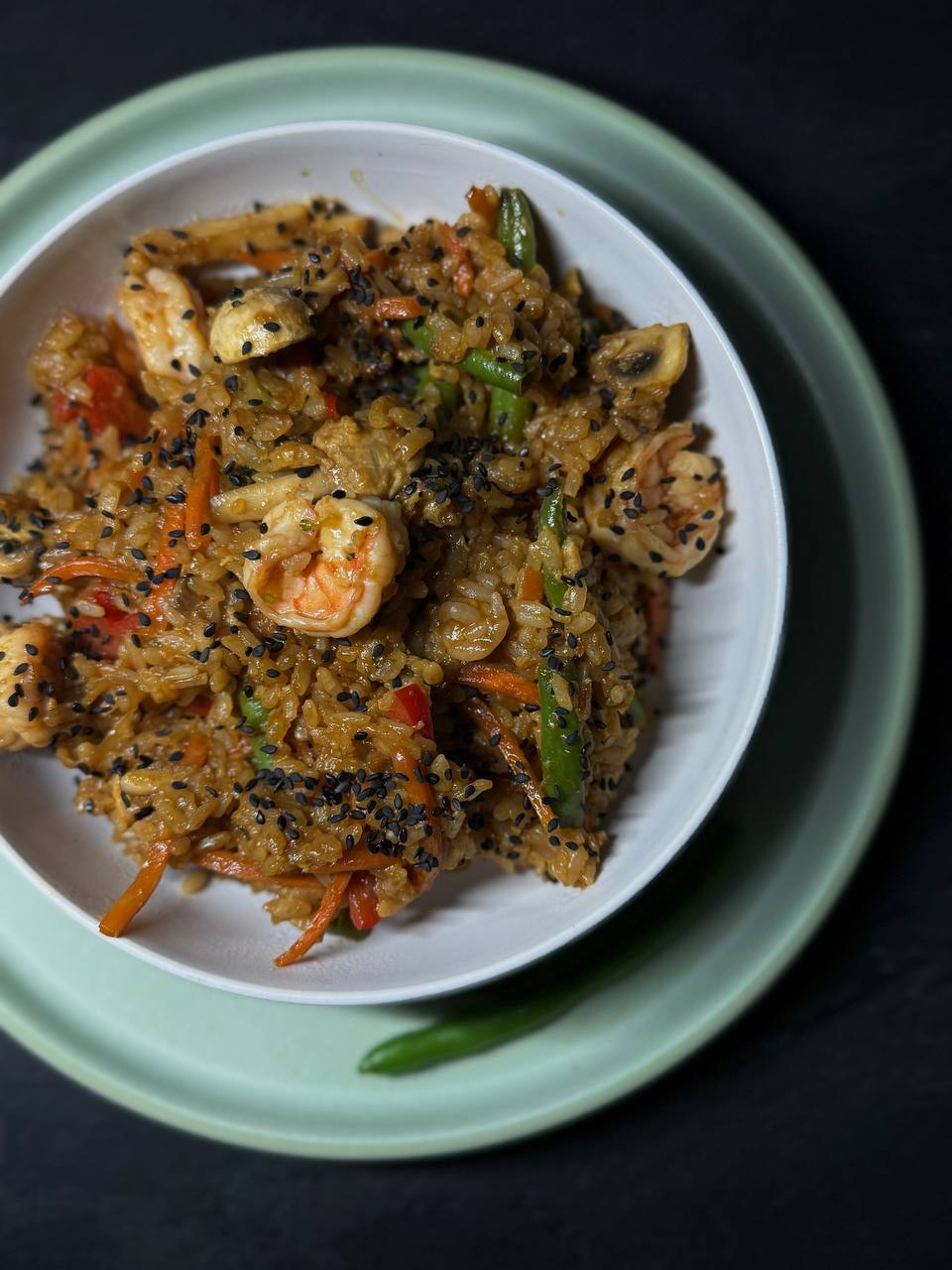 Смажений рис з тигровими креветками, морквою, цибулею, меланж, солодким перцем, броколі та стручковою квасолею, обсмажений у соєво-унагі соусі, подається із зеленою цибулею та кунжутом.