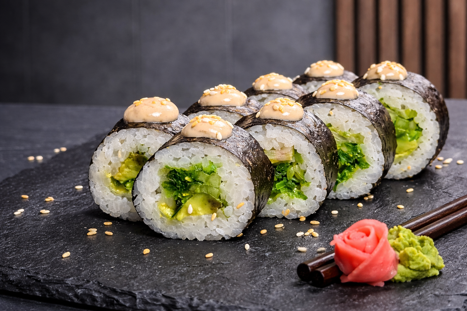 Легкий та свіжий футомакі для любителів овочевих ролів. Усередині — хрусткий огірок, ніжне авокадо та салат чука, які ідеально поєднуються з ароматним горіховим соусом. Завершує смак легка посипка кунжуту, додаючи ролу приємної текстури та східної нотки.