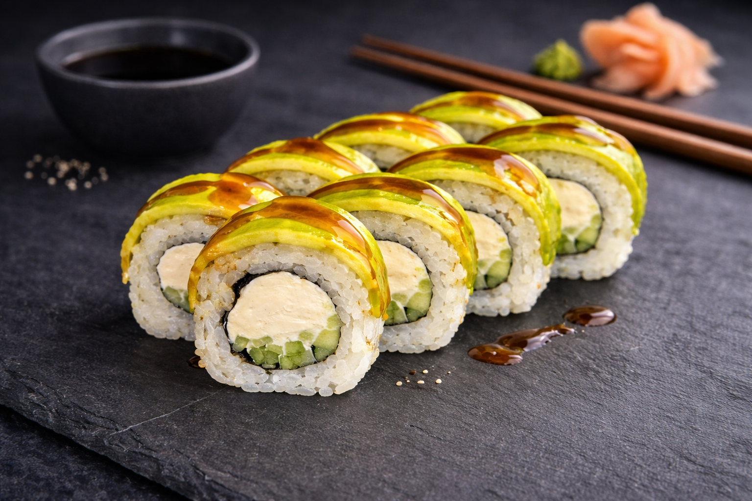 Ніжний крем-сир у поєднанні зі стиглим авокадо та соусом понзу, який додає ролу приємної пікантності та легкої цитрусової нотки.