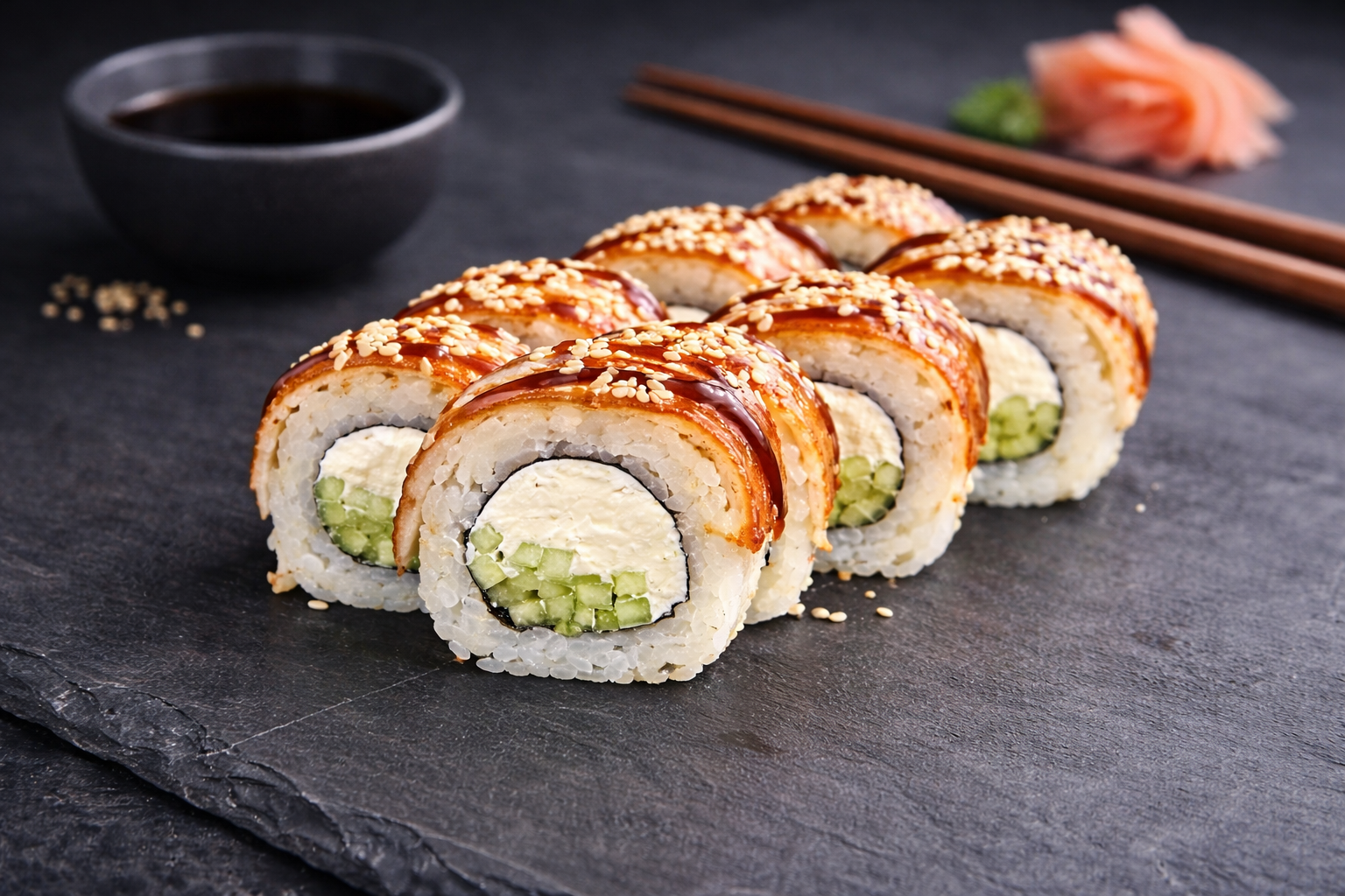 Наверху рол прикрашенный соусом унаги и свежее обмазанное кунжутом, что на самом деле является самым насыщенным солодко-пикантным вкусом.