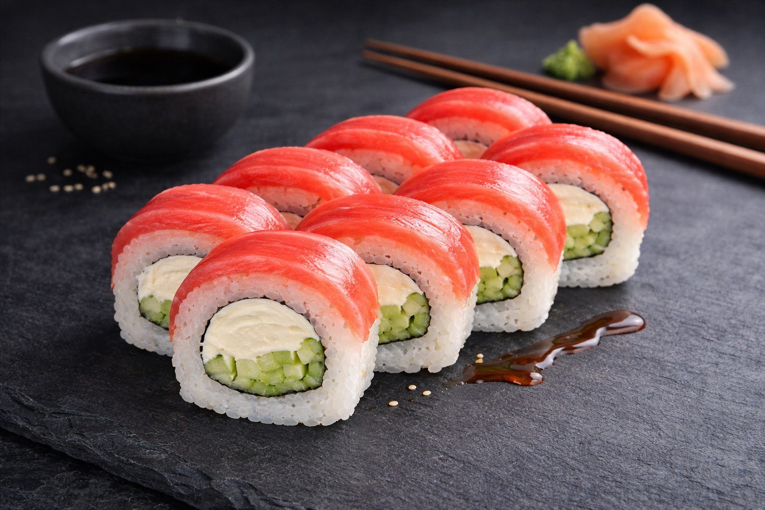 Легкий, свіжий та дуже збалансований рол, який ідеально підходить для поціновувачів класичних смаків.Подається з соусом Понзу