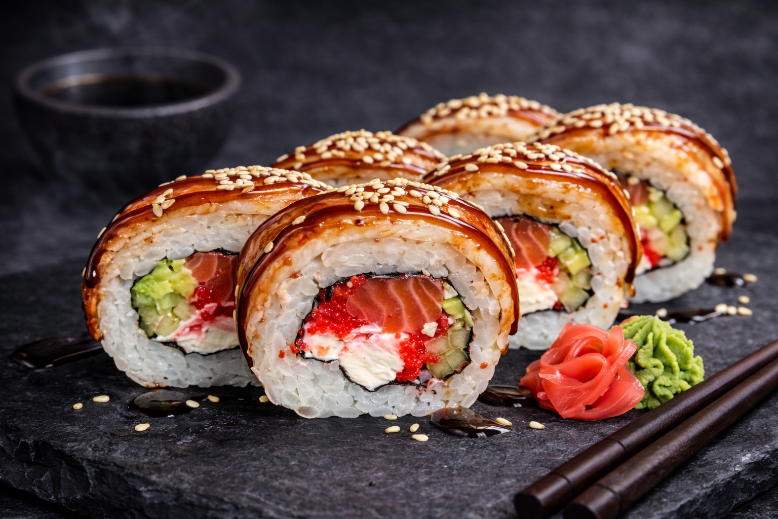Завершує композицію соус унагі та обсмажений кунжут, що додає легку солодкувату нотку та ідеальний баланс смаку.
