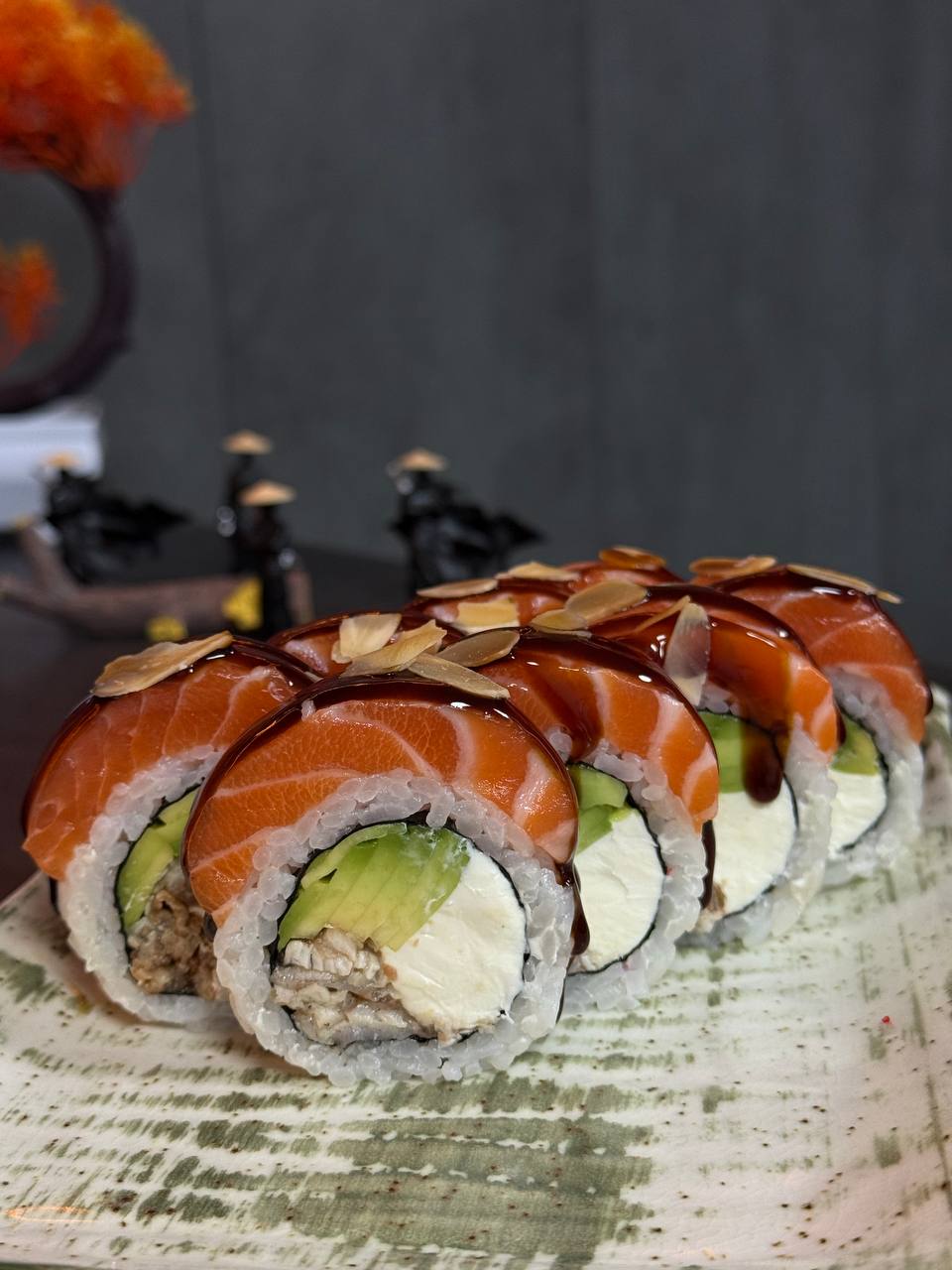 Зверху – щедрий шар свіжого лосося, политий соусом унагі та доповнений хрусткими мигдальними пластівцями.