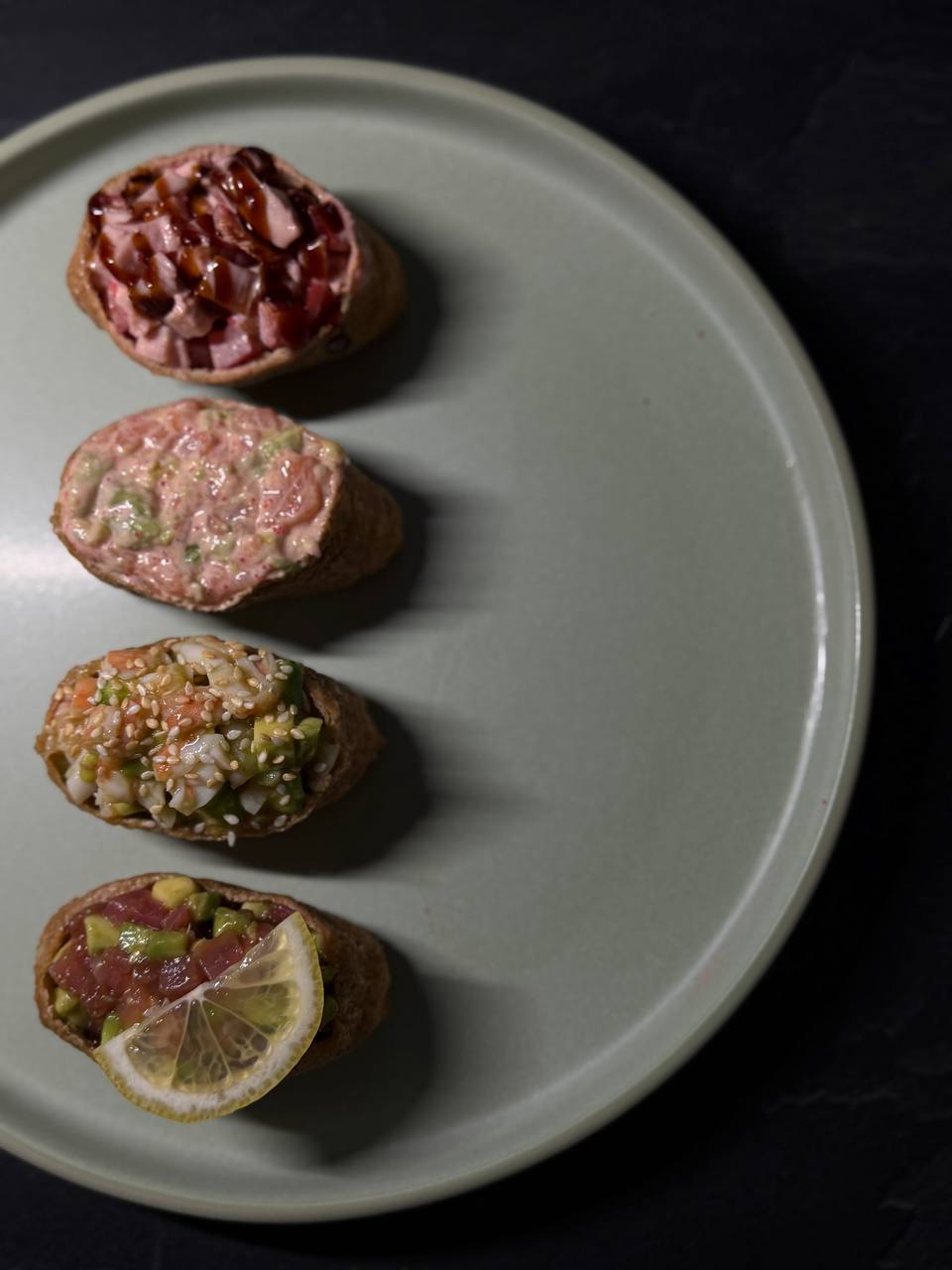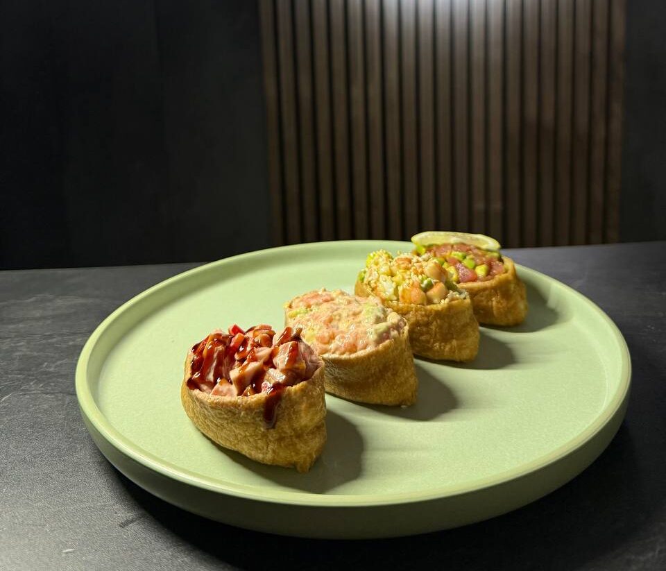 Мішечок тофу з ніжним рисом, свіжий тунець, кремове авокадо та соус понзу з легкою лимонною кислинкою. Легкий та освіжаючий смак.